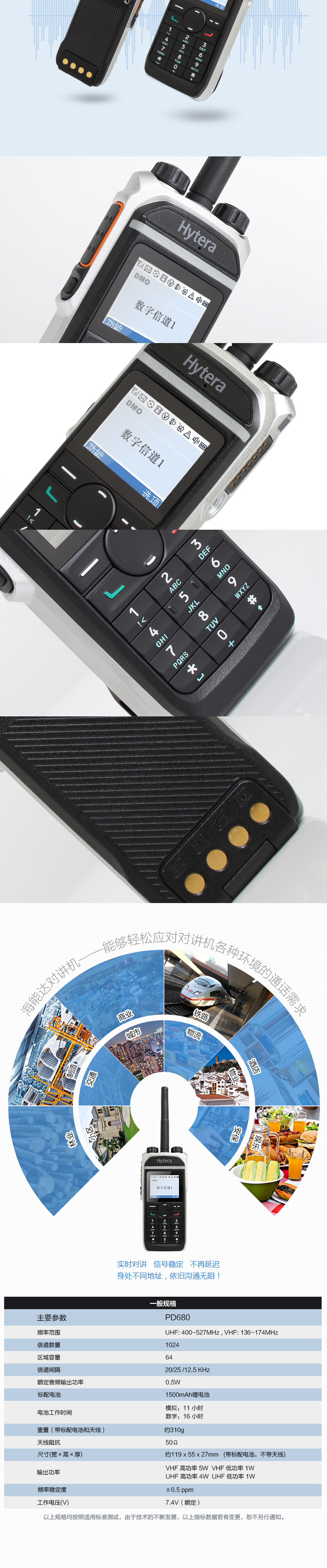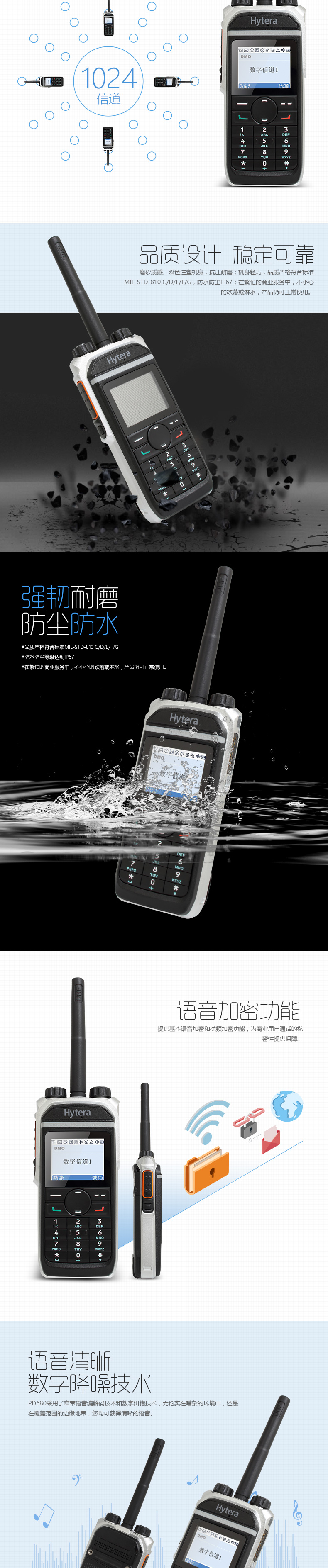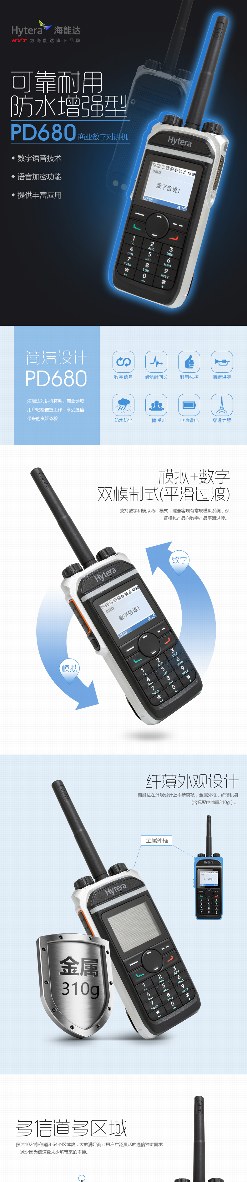 Hytera海能达PD680商业PDT数字对讲机,采用创新金属边框和数字键外观设计,质感和档次彰显无遗;机身防护等级高达IP67,即使身处恶劣的气候条件与苛刻的环境中仍能保障畅通无阻的通信。