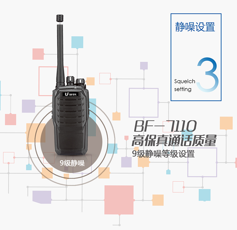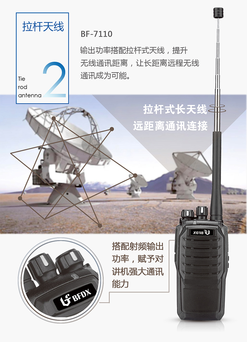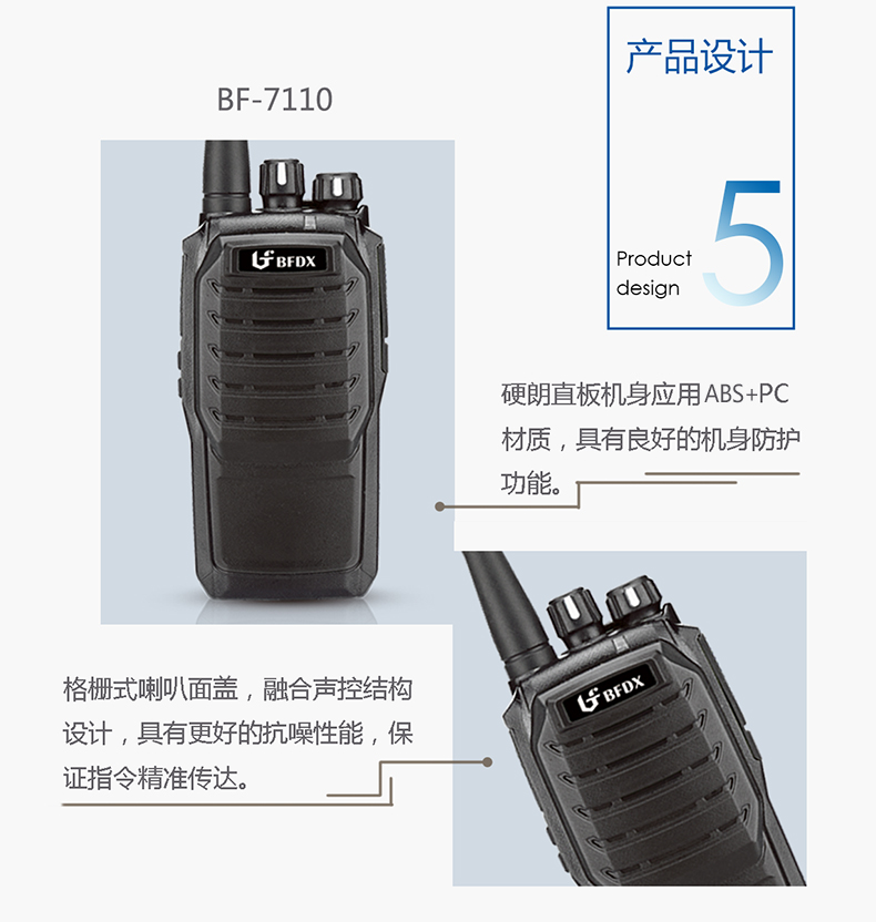 北峰对讲机BF-7110 射频输出功率搭配拉杆式天线,最大限度提升无线通信距离。栅格式喇叭面盖,融合声腔结构设计,具有非凡的抗噪、抗干扰性能,保证每一个声信指令精准传达。整机应用高级PC材质,良好防护机身,抗震抗跌达1.5米。丰富的声控通话、信道监听、发射提示音、9级静噪设置等通信功能,是建筑对讲机、工程对讲机、物业对讲机、安保对讲机等的首选。