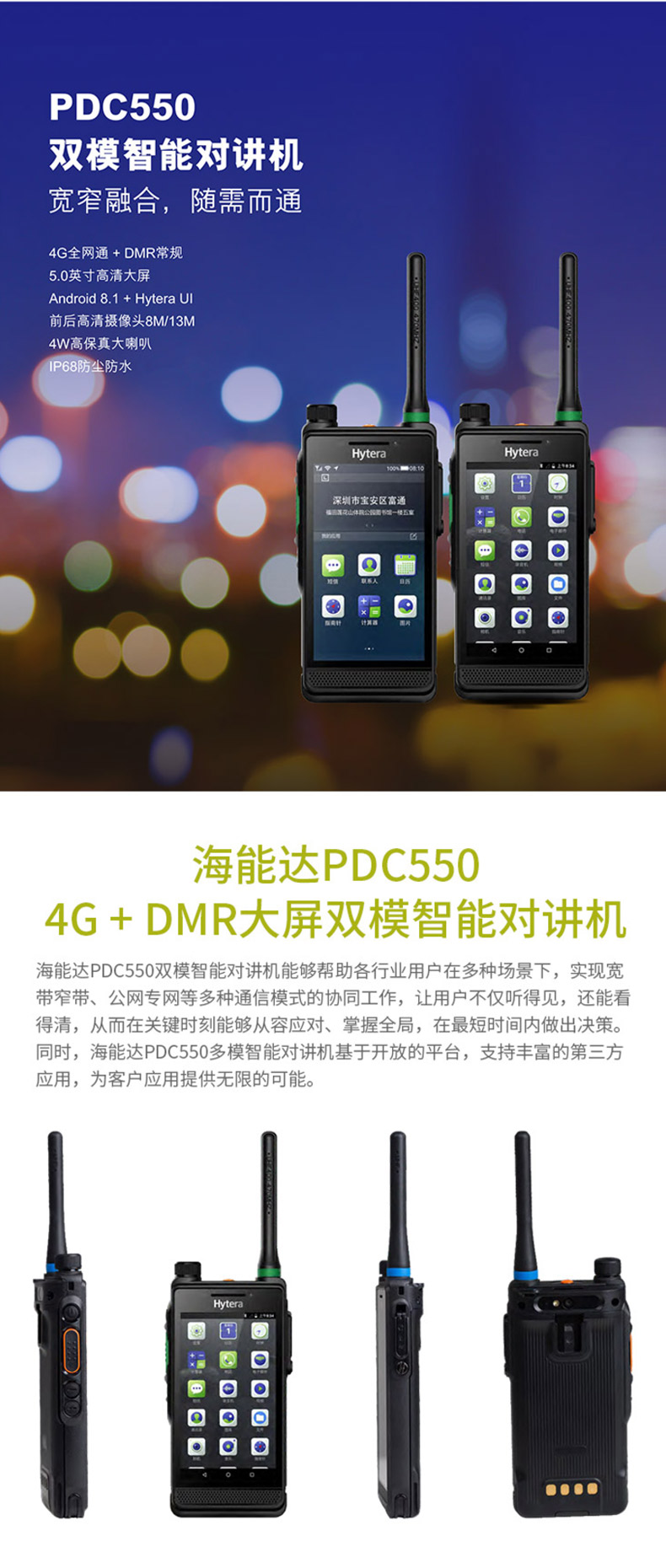 Hytera海能达PDC550集公网对讲及专网对讲(DMR直通)合二为一,除通过公网对讲解决用户通话距离的限制外,还提供丰富的多媒体数据业务的应用,如WIFI,蓝牙,GPS,拍照、视频、NFC等,为客户实现语音和宽带业务的完美融合。