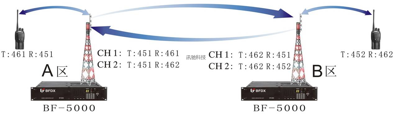 使用具备扫描功能的中转台,可以在每一区的中转台上设定多个中转信道。中转的扫描功能与普通的对讲机接收扫描功能有所不同,中转扫描功能指机器在扫描过程中不但能检测并接收已设定的射频信号,而且能根据射频信号的不同自动切换中转信道。如下图: