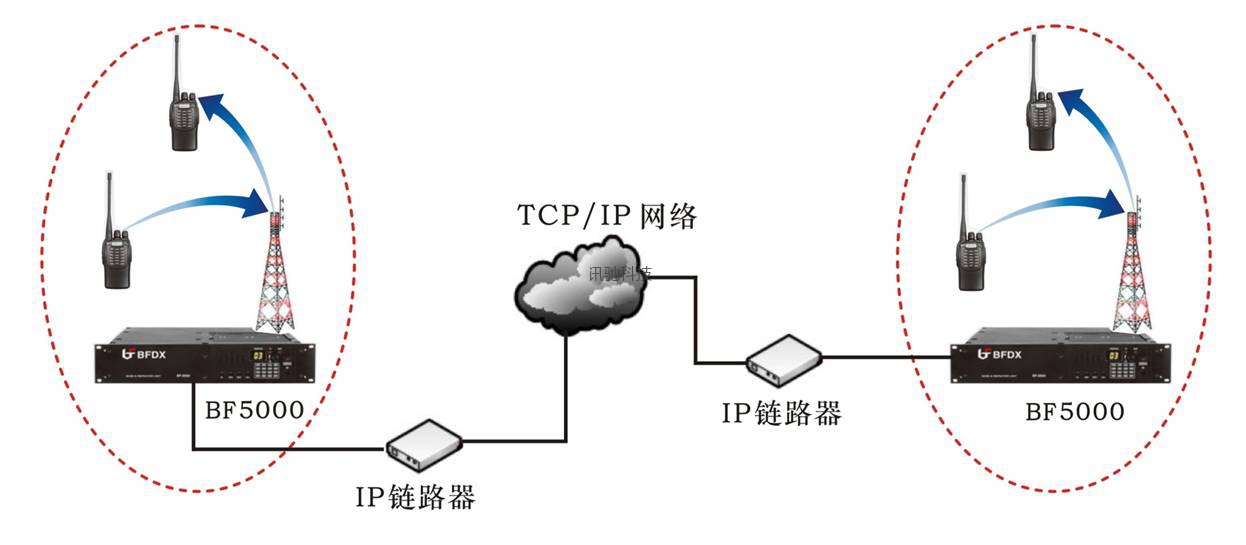 采用不具备扫描方式的中转台作为中转设备,要实现多区的联网方式,可在每个区域多增设一台中转台做链路机,中转台信道机通过有线连接控制板控制链路机的发射。如下图: