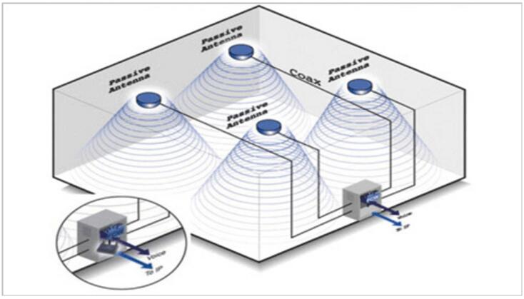 2、办公楼内部布设天馈分布系统,解决室内信号覆盖问题 天馈分布系统由室内全向天线、平板定向天线、耦合分配器、功率分配器、干线放大器、连接器、低损耗射频电缆、泄漏电缆等设备组成,结合国家电磁辐射标准和酒店建筑结构,将天线分布在办公楼的每个角落,然后通过电缆与基站中心相连,使无线信号通过天线进行接收或发射,以此达到整个酒店区域内的无线信号覆盖;